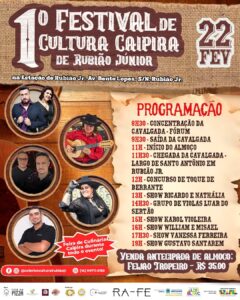 Rubião Júnior recebe, no dia 22 de fevereiro, o 1º Festival de Cultura Caipira de Rubião Júnior, evento que celebra as tradições do interior paulista por meio da música raiz, da gastronomia típica, da cavalgada e de manifestações culturais ligadas ao modo de vida caipira. A programação acontece na Estação de Rubião Júnior, localizada na Avenida Bento Lopes, s/nº.