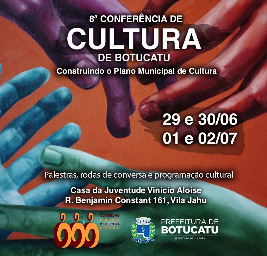 A Secretaria Municipal de Cultura de Botucatu e o Conselho Municipal de Cultura convidam você para participar da Conferência Municipal de Cultura, onde discutiremos os caminhos e políticas públicas para o desenvolvimento cultural de nossa cidade.