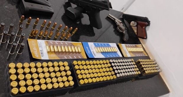 Com a autorização do filho, a equipe vistoriou a residência e localizou uma pistola calibre 380, uma garrucha calibre 22 e um simulacro de arma de fogo, além de cem munições de calibre 45, cento e dez de calibre 38, vinte e oito de calibre 380 e vinte de calibre 32.