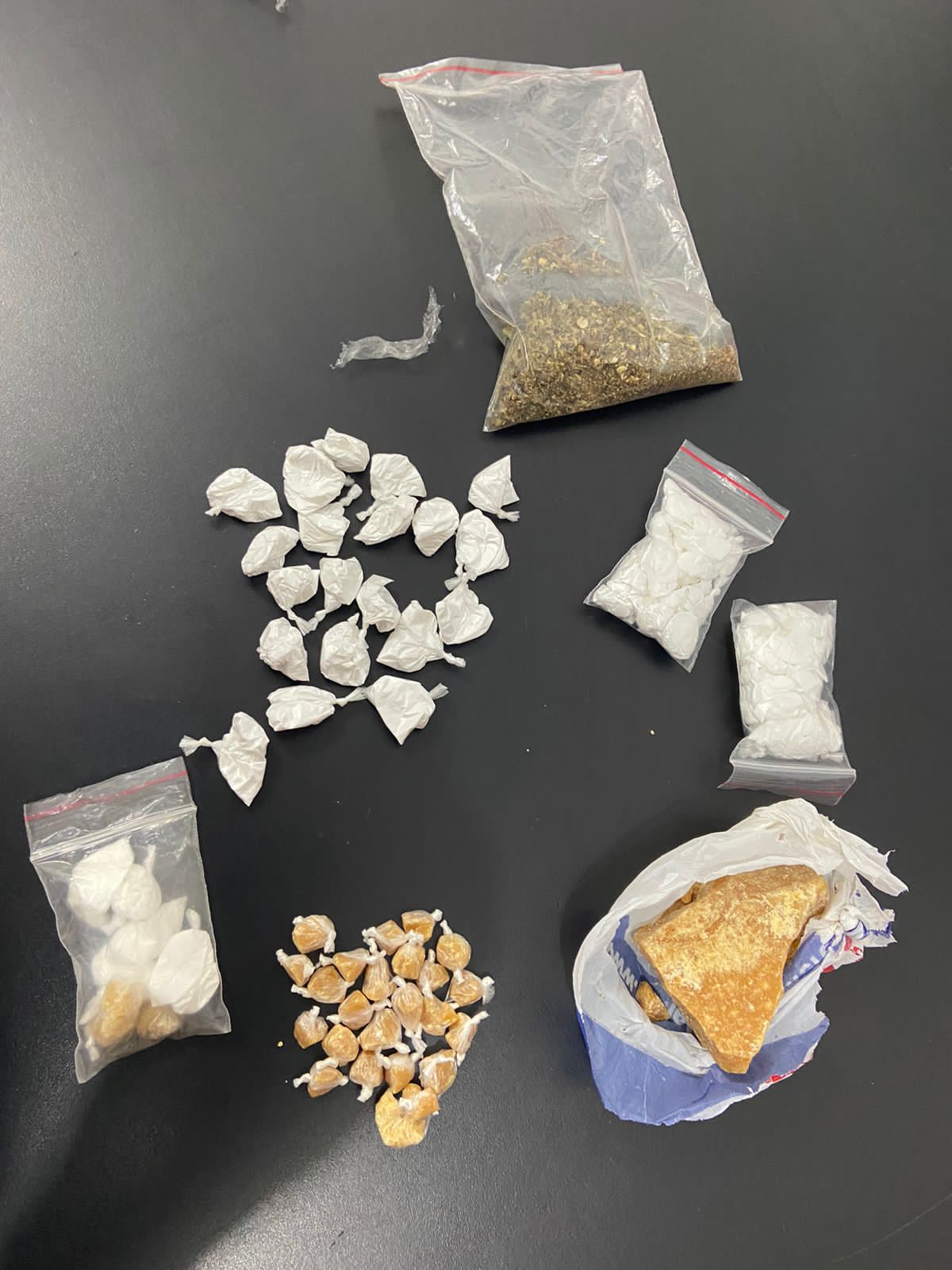 Ao ser realizar a abordagem e a vistoria pessoal, foi localizada com eles uma certa quantidade de drogas.