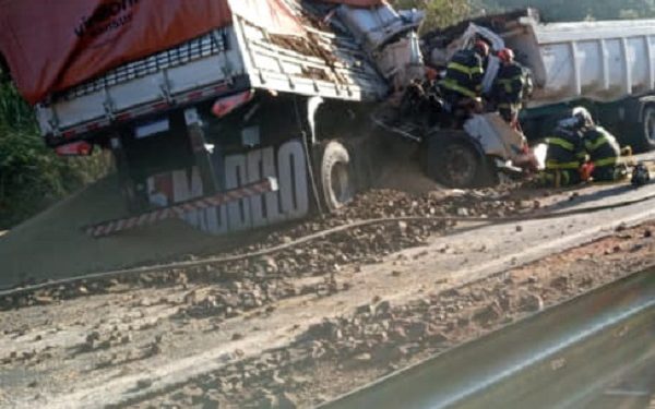 De acordo com o Corpo de Bombeiros, o acidente ocorreu na altura do quilômetro 293, depois que um dos veículos invadiu a pista contrária. Ao tentar impedir a colisão frontal, o motorista que seguia no sentido oposto desviou pelo acostamento, momento em que uma das carretas de carga atingiu a frente do outro caminhão.