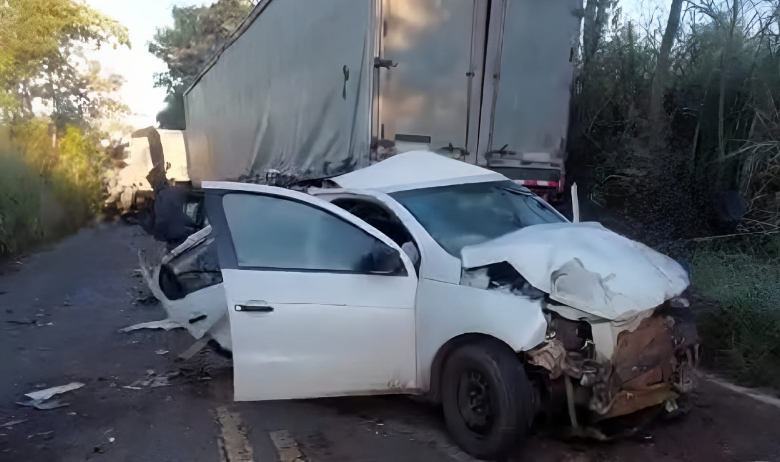 Segundo relatos iniciais, o automóvel colidiu na traseira de um dos caminhões, perdeu o controle e girou sobre a pista. Na sequência, invadiu a contramão e foi atingido frontalmente por outro caminhão que trafegava no sentido contrário.