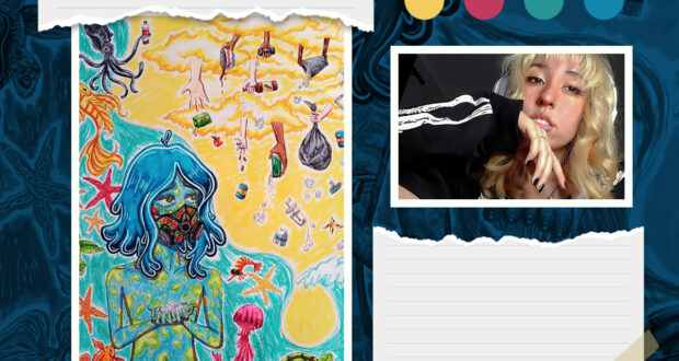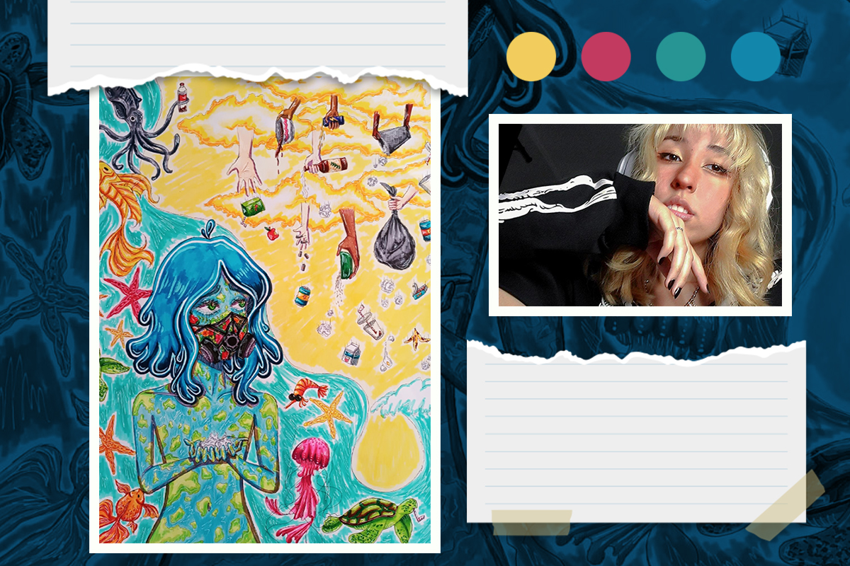 Bruna conta que pesquisou o assunto e refletiu sobre como fazer a representação. Ela optou por desenhar a poluição em si, por acreditar que causaria mais impacto em quem observar o desenho. “Sabemos o que é reciclagem, como reciclar, mas não temos o costume de ver o lixo e o que acontece se não há redução do consumo e reutilização de embalagens”, conta a estudante do Ensino Médio Integrado ao Técnico de Jogos Digitais.