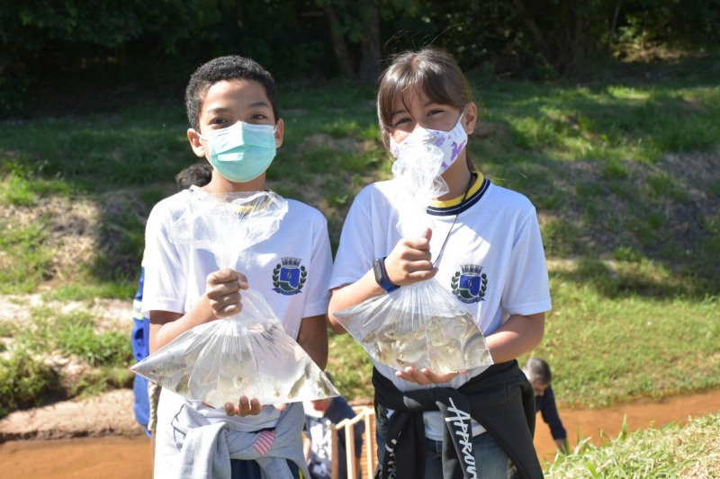 Em uma ação conjunta entre a Secretaria de Educação, Secretaria do Verde e Sabesp, os estudantes efetuaram a soltura de 4.100 alevinos (filhotes de peixes) nativos da região de Botucatu, no Ribeirão Lavapés, na Cohab I.