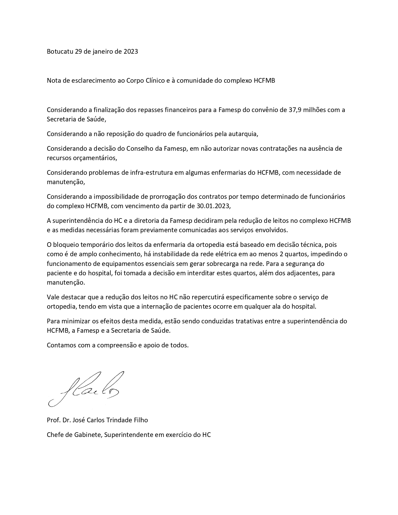 Recebemos como denúncia de um membro do corpo clínico do HC uma nota de esclarecimento a qual foi confirmada sua veracidade pela assessoria de imprensa do Hospital das Clínicas, assinada pelo Prof. Dr. José Carlos Trindade Filho, chefe de gabinete e superintendente em exercício do HC, sobre algumas mudanças internas que podem supostamente atingir os pacientes que necessitarem de atendimento.