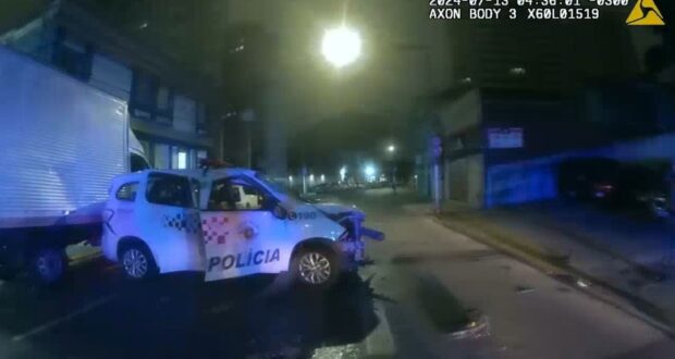 A câmara corporal de um policial militar gravou o momento em que ele pergunta a um colega de farda em outra viatura: “Apostar um racha?” Em seguida, o soldado acelera o carro oficial da Polícia Militar (PM) de São Paulo até bater em dois veículos que estavam estacionados e também no poste de um semáforo.