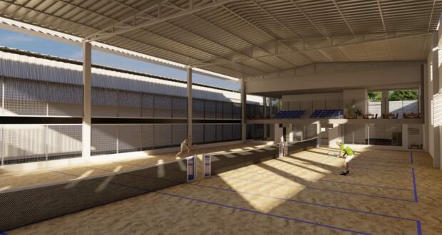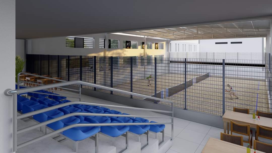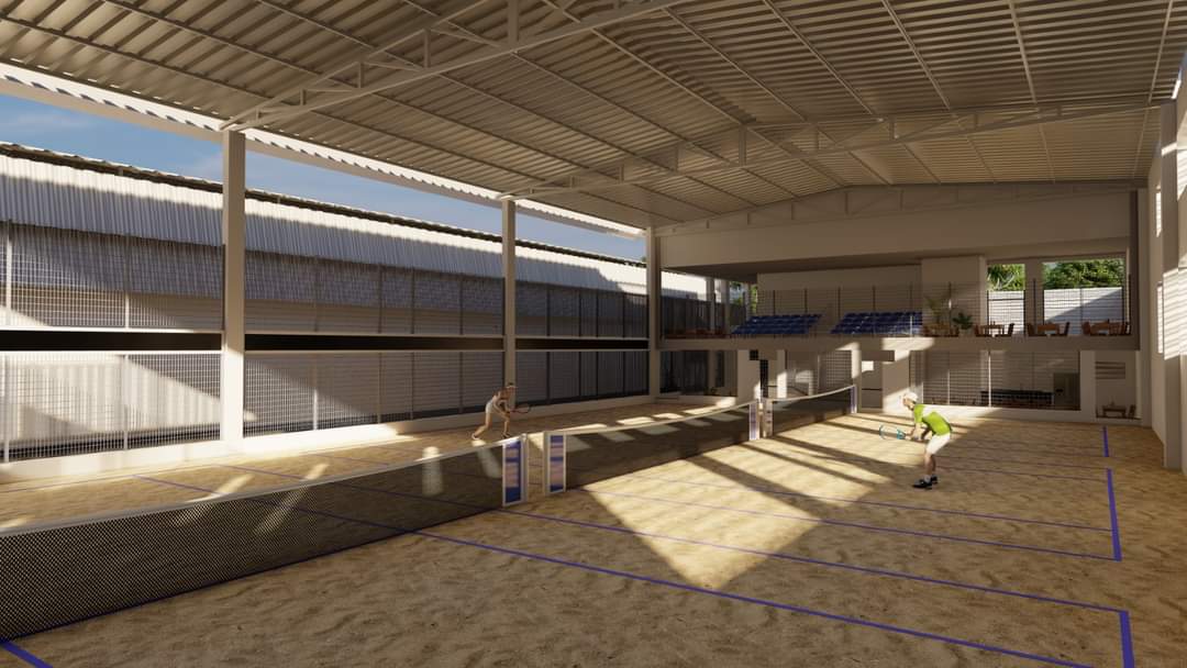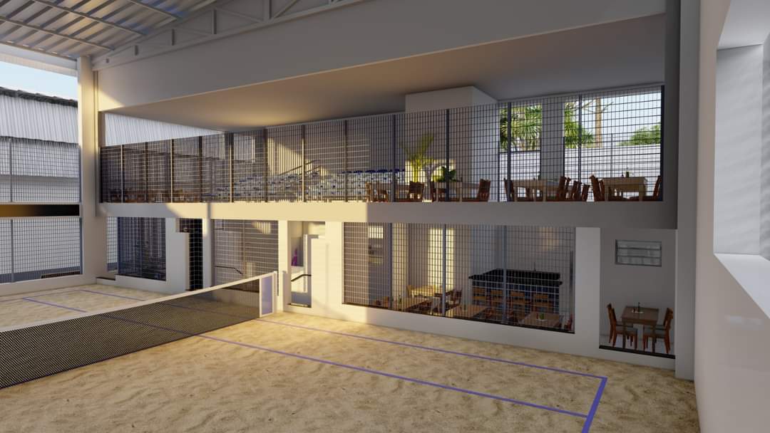 Um projeto arquitetônico da Mastequim e Lemos Arquitetura e Urbanismo, com uma área construída de 807,78 m2, de uma arena esportiva com 3 quadras de areia para beach tennis, vôlei e fut-vôlei, construídas lado a lado, edificação mista em concreto armado/alvenaria e estruturas metálicas com arquibancadas para até 70 pessoas sentadas, vestiários, copa, depósito, área para descanso e espera e caixa d’água para até 15.000 litros.