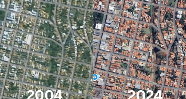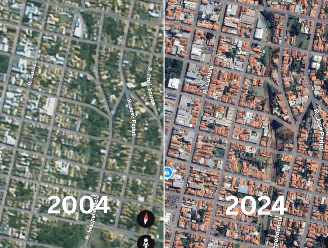 Na imagem de 2004, nota-se uma faixa expressiva de áreas verdes acompanhando o curso do córrego, cumprindo a função de Área de Preservação Permanente (APP), prevista no Código Florestal (Lei nº 12.651/2012). Ao longo dos anos, essa vegetação foi gradualmente substituída por construções, solo exposto e obras de canalização.