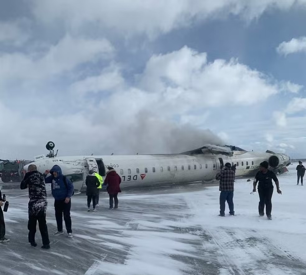 Imagens feitas do aeroporto de Toronto, no Canadá, registraram o momento em que um avião capotou ao pousar no aeroporto na segunda-feira (17).