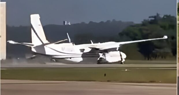 Imagens feitas logo após o pouso de “barriga” mostram como ficou o avião na pista do aeroporto de Sorocaba (SP), nesta segunda-feira (10). Nas imagens, é possível ver uma das rodas torcida.