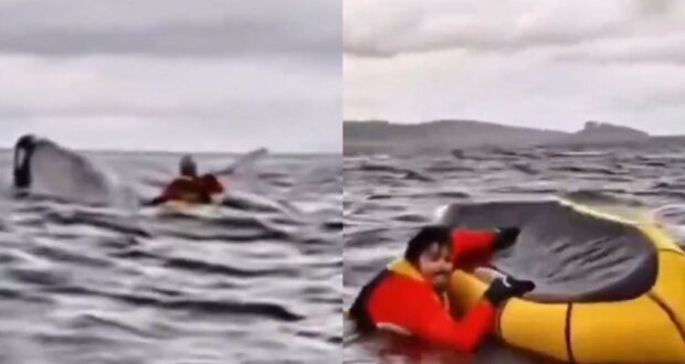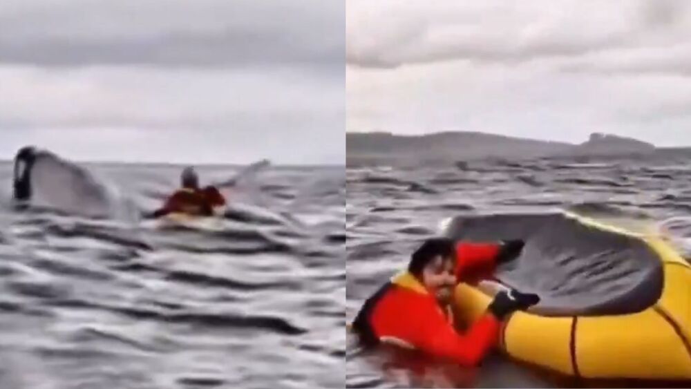 Uma baleia jubarte “engoliu” um homem que estava em um caiaque na costa do sul do Chile no sábado (8) e o cuspiu logo na sequência. O pai dele, que estava com uma câmera, registrou o momento.