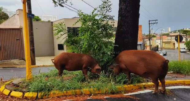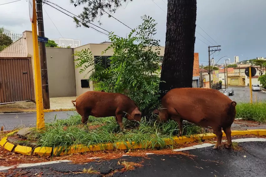 Dois porcos de grande porte atravessaram ruas com fluxo intenso de veículos em Bauru e foram flagrados revirando lixo na manhã desta quinta-feira (26), no cruzamento das ruas Olavo Bilac e São Lourenço, próximo ao Fórum, na divisa entre o Jardim Bela Vista e o Centro. A cena tem sido recorrente: além de porcos, há também casos de cavalos vagando livremente pelas vias públicas.
