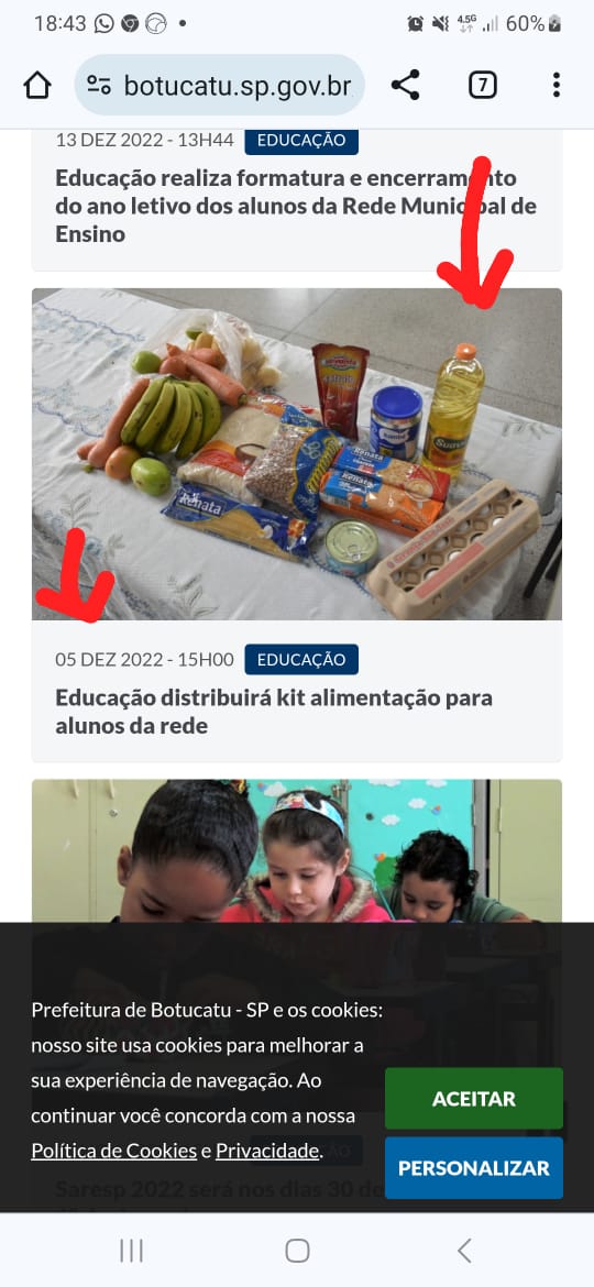 Já uma foto do kit fechado, que é entregue nas férias para as crianças levarem para casa, foi publicada no dia 10 de março de 2021. E, a outra foto com o kit aberto, foi publicada no dia 06 de dezembro de 2022. Ambas no site oficial da Secretaria de Educação.