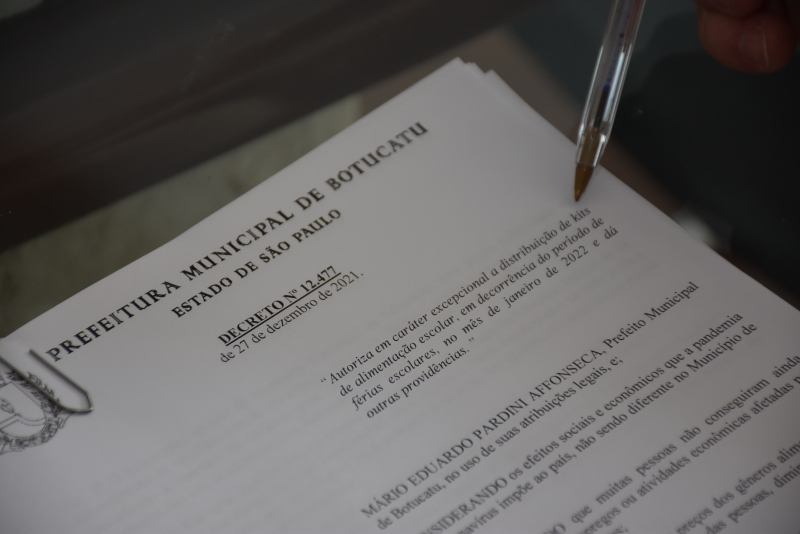 Foto: Decreto 12.477 de 27 de Dezembro de 2021, do prefeito Mário Pardini autorizando a distribuição dos kits de alimentação no período de férias escolares