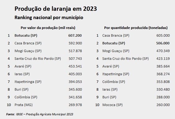 A produção de laranja no município de Botucatu (SP) alcançou a primeira posição do ranking nacional referente ao valor da produção do ano de 2023. Em relação à quantidade produzida, também no ano de 2023, o município ficou na segunda posição, atrás apenas de Casa Branca, também do estado de São Paulo.