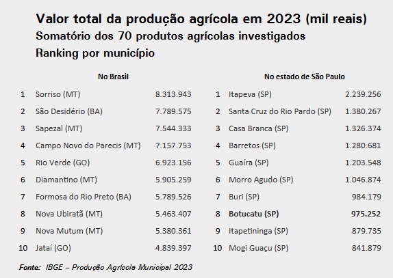 No somatório do valor de produção de todos os 70 produtos agrícolas investigados na pesquisa do IBGE, o município de Botucatu (SP) ficou na 8ª posição no estado de São Paulo e na 136ª posição entre os 5.563 municípios do Brasil com dados divulgados no levantamento.