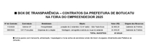 O primeiro contrato, nº 172/2025, foi firmado diretamente com o Sebrae-SP, via inexigibilidade de licitação, no valor de R$ 32.580,00, referente à locação de dois estandes de 12 m² cada, localizados na Rua D, espaços CD 560 e CD 561, identificados como “Prefeitura de Botucatu”.