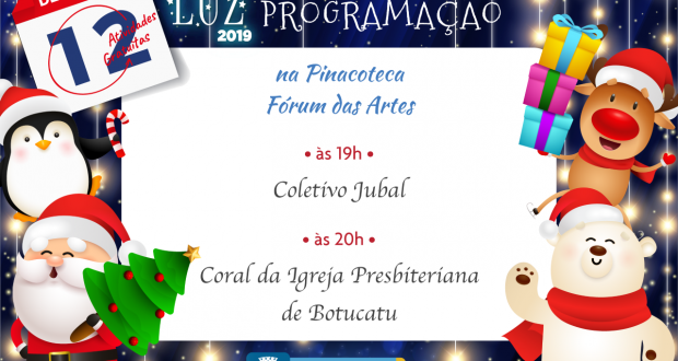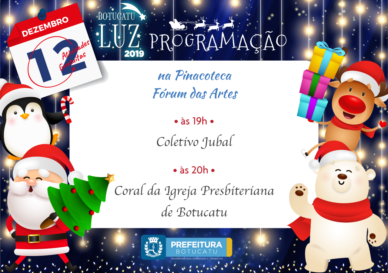 As apresentações do Botucatu Luz 2019 na noite desta quinta-feira, 12, serão na Praça da Pinacoteca. As apresentações começam às 19 horas com Coletivo Jubal e em seguida, às 20 horas, o Coral da Igreja Presbiteriana Central cantará canções gospel e natalinas.