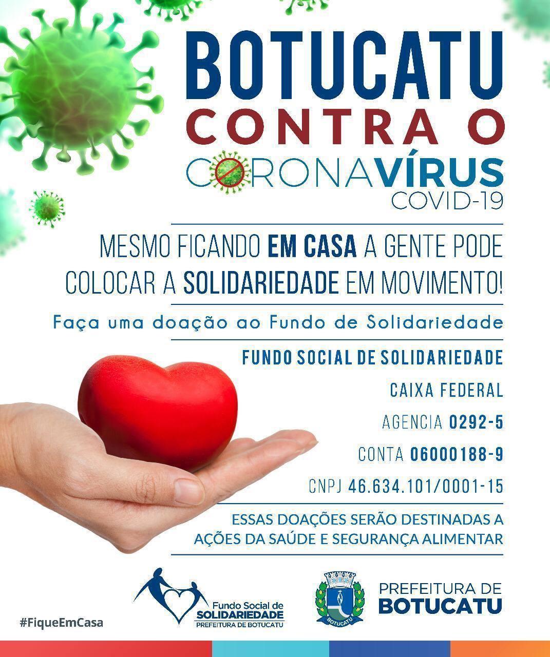 Atendo a pedidos de cidadãos e empresas da Cidade, o Fundo Social de Solidariedade de Botucatu disponibilizou uma conta bancaria para receber doações em virtude do enfrentamento da Covid-19, doença causada pelo novo coronavírus.