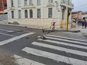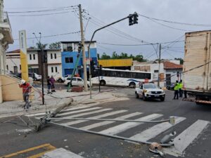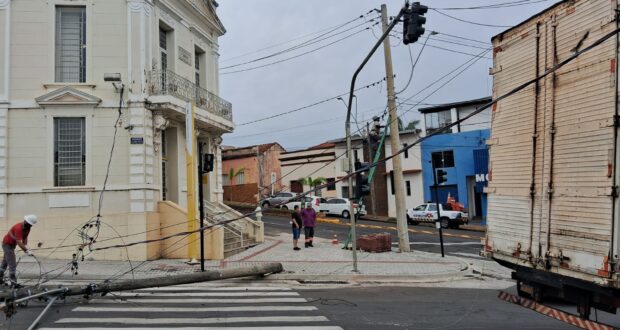 Na manhã desta quarta-feira, (5), um novo incidente envolvendo a infraestrutura urbana de Botucatu chamou a atenção dos moradores e motoristas. Um caminhão, ao transitar pela confluência das Avenidas Floriano Peixoto e Santana, nas proximidades da agência dos Correios, esbarrou na fiação elétrica aérea, resultando no tombamento de um poste.