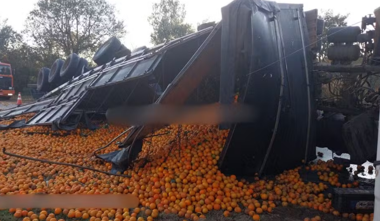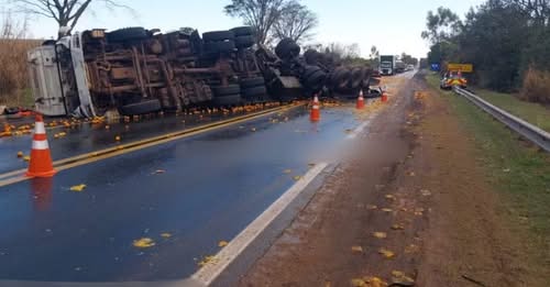 Um caminhão carregado de laranjas tombou na tarde da sexta-feira (25) na altura do km 219 da rodovia João Mellão (SP-255), no sentido norte, em Pratânia.