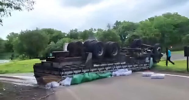 Um caminhão tombou, no início da manhã desta quarta-feira (04),nas proximidades da rotatória da Barra Bonita que liga a cidade de Mineiros do Tietê , já bem próximo a entrada Usina da Barra.