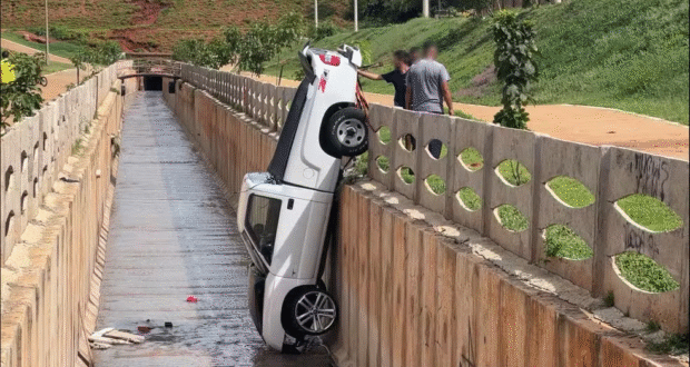 De acordo com a apuração da reportagem, o veículo estava estacionado na Rua Dr. Heitor de Andrade Campos quando apresentou falha no sistema de freios. Sem controle, a caminhonete desceu a via, rompeu a defensa de concreto que protege o córrego e acabou caindo no curso d’água.