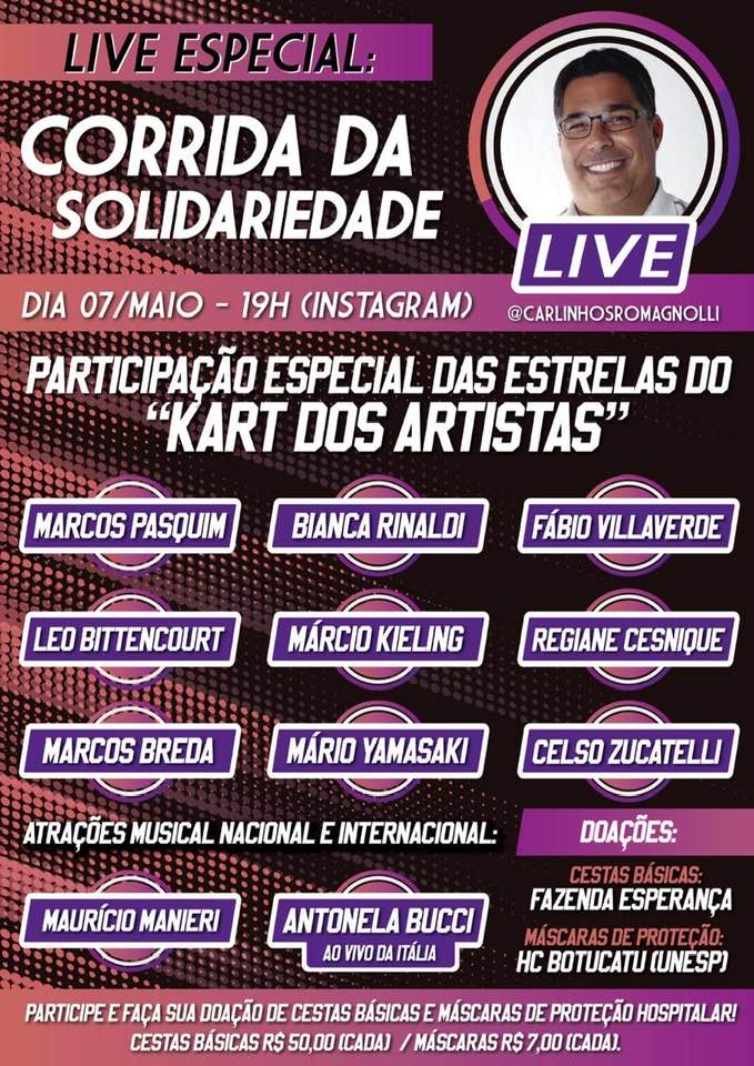 De acordo com Romagnolli, ele estará fazendo uma Live, no Instagram, com a participação especial do cantor Mauricio Manieri e a estrela internacional Antonella Bucci. “Essa Live será no dia 7 de maio à partir das 20 horas. O objetivo é arrecadar cestas básicas para a Fazenda Esperança que abrigou mais de 500 moradores de rua devido ao corona vírus e máscaras para o hospital das Clinicas da Unesp, de Botucatu”, informou o empresário.