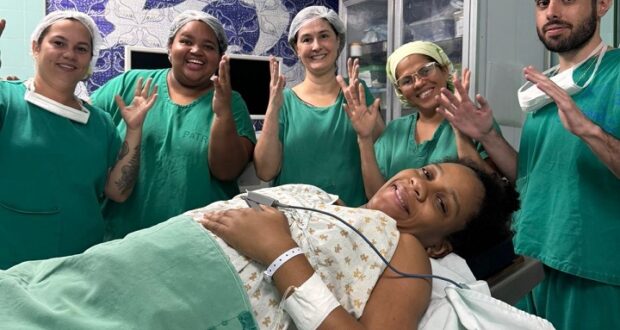 Após o nascimento, os profissionais de saúde aprenderam a sinalizar “Parabéns” em Libras para celebrar o momento com a mãe.