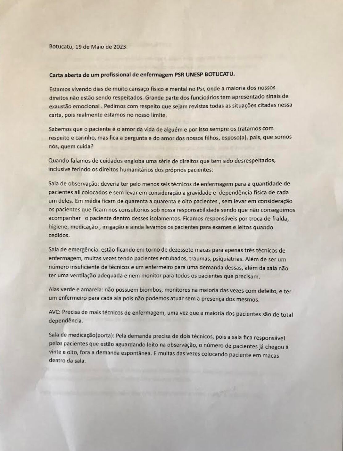 Carta aberta de um profissional de enfermagem PSR UNESP BOTUCATU.