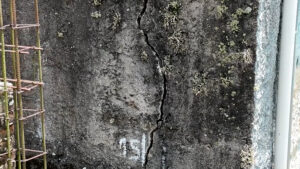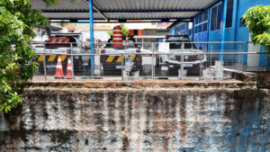 O problema se agrava com o período de chuvas, comum no início do ano. As imagens mostram grandes trincas no muro, algumas com medições que chegam a cerca de 1,5 centímetro, além de rachaduras visíveis no pavimento superior. Também é possível notar a inclinação da estrutura em direção à rua, o que aumenta o risco para pedestres que utilizam a calçada — que, segundo moradores, já é precária por si só.