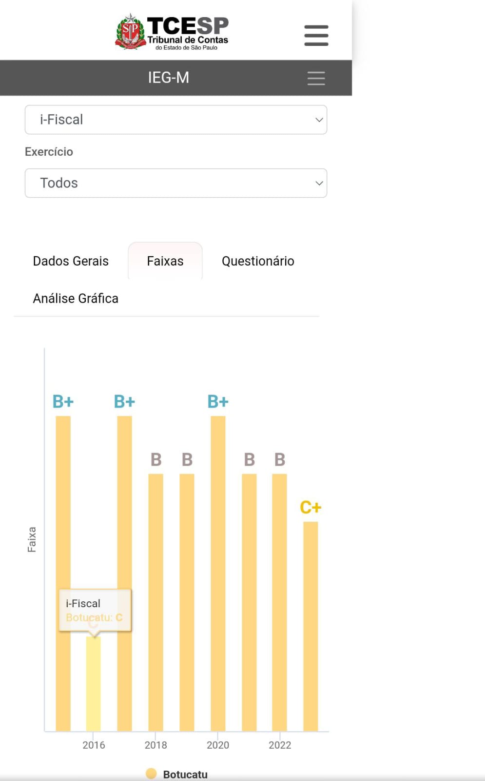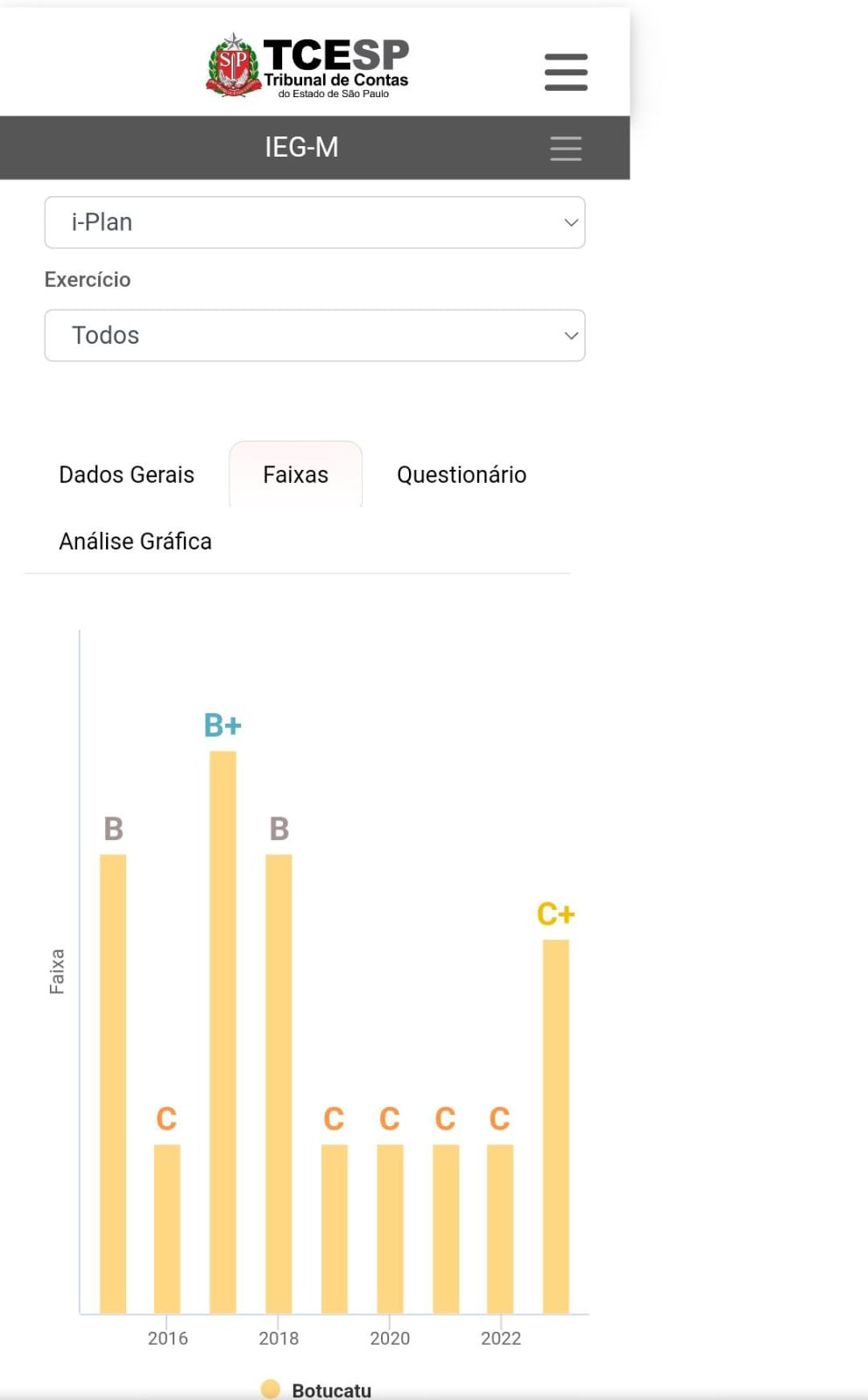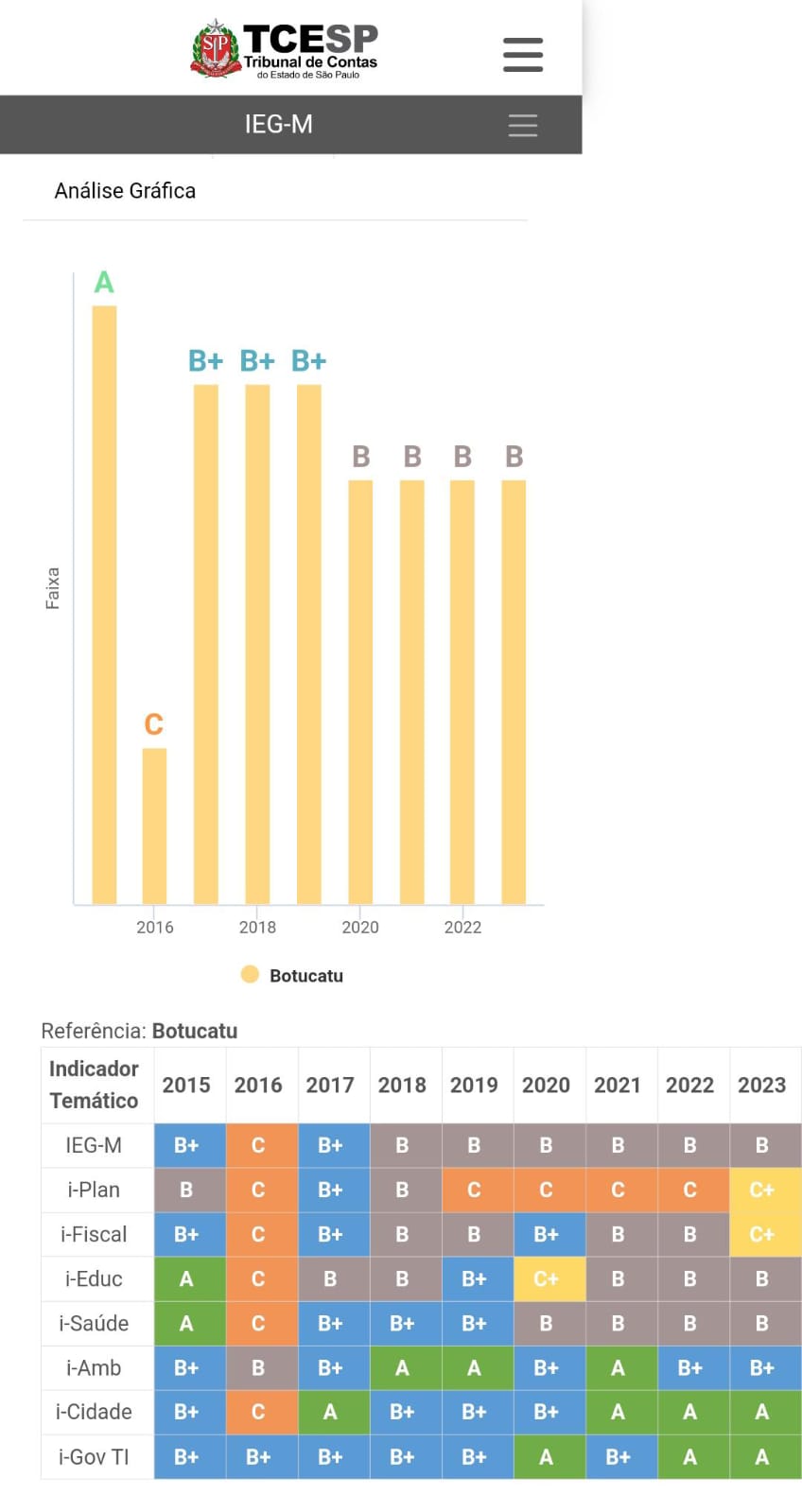 Botucatu não apresentou avanços significativos no Índice de Efetividade da Gestão Municipal (IEG-M) em 2023. A cidade permaneceu com índice geral B, mas está deficiente em relação a setores como Planejamento e Finanças, recebendo apontamentos importantes do Tribunal de Contas do Estado de São Paulo (TCE-SP) no ano de 2023.