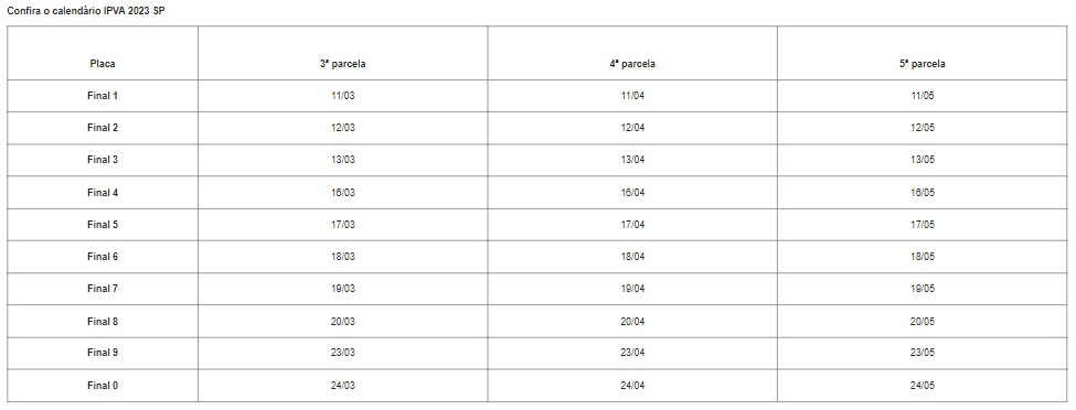 São Paulo, março de 2023 – A terceira parcela do IPVA (Imposto sobre a Propriedade de Veículos Automotores) dos automóveis registrados no estado de São Paulo começa a vencer neste sábado (11). As datas variam de acordo com o final da placa de cada veículo.