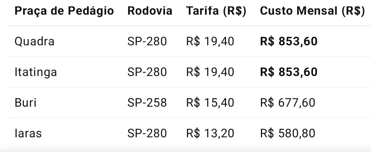Para quem trafega diariamente por uma praça de pedágio (ida e volta) durante os dias úteis do mês (22 dias), os custos podem ser significativos. Confira abaixo os custos mensais estimados para veículos leves: