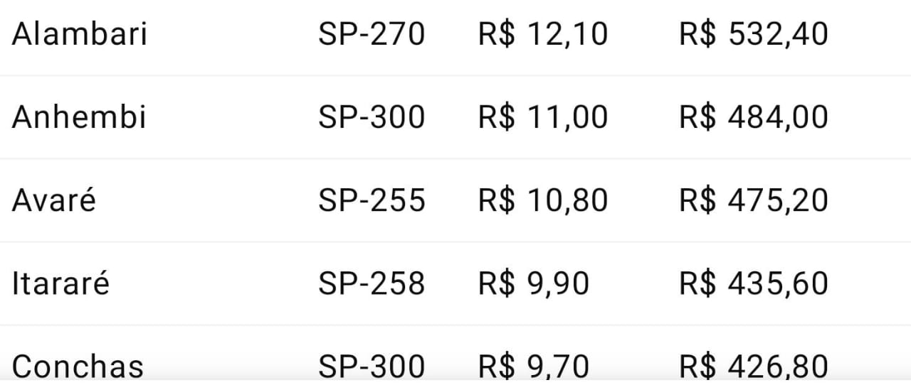Em Anhembi, o valor sobe para R$ 11,00, enquanto em Areiópolis, a tarifa fica em R$ 8,60.