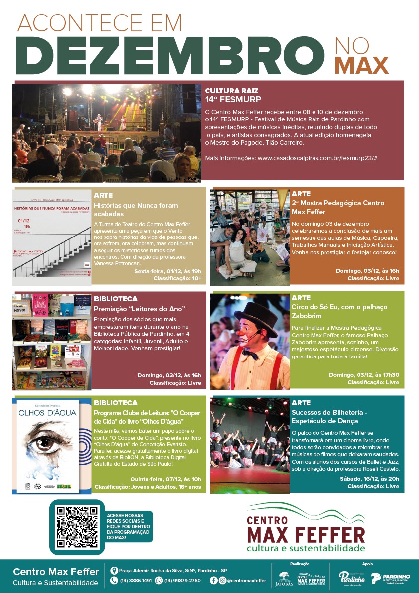 Dezembro chegou e juntamente com ele muita cultura popular, festival de música raiz e outras opções de lazer no Centro Cultural Max Feffer, em Pardinho. A programação do mês teve início na última sexta-feira, 1/12, com a apresentação do Grupo de Teatro formado por alunos do Max, que exibiram a peça ‘Histórias que nunca foram acabadas’. Ainda no final de semana de 2 e 3 de dezembro, aconteceu a 2° Mostra Pedagógica do Centro Max Feffer. Durante a Mostra, se apresentaram os grupos de Música, Capoeira, Trabalhos Manuais e de Iniciação Artística. O encontro promoveu também premiações da biblioteca e um espetáculo circense.
