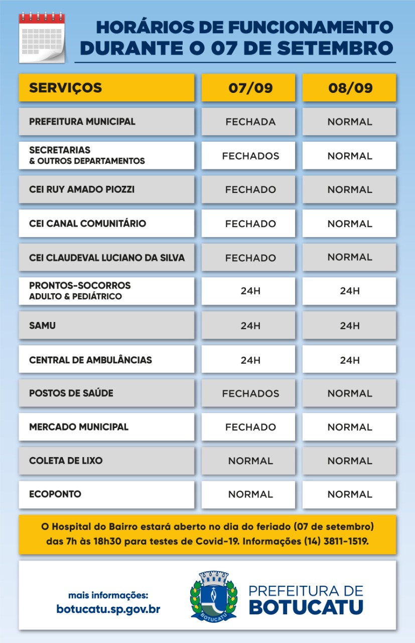A Prefeitura de Botucatu informa que as repartições públicas municipais não funcionarão na próxima quarta-feira, 07, feriado nacional em que se comemora a Independência do Brasil, que este ano completa 200 anos. O expediente voltará ao normal na quinta-feira, 08.
