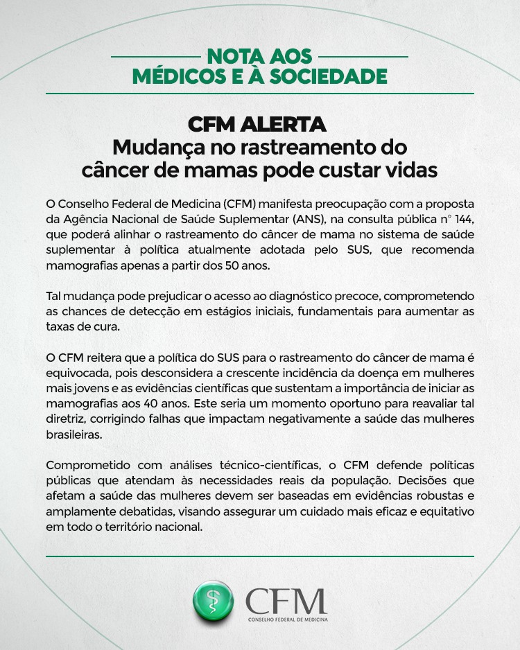 O Conselho Federal de Medicina (CFM) está preocupado com a consulta pública nº 144, proposta pela Agência Nacional de Saúde Suplementar (ANS), “que poderá alinhar o rastreamento do câncer de mama no sistema de saúde suplementar à política atualmente adotada pelo SUS, que recomenda mamografias apenas a partir dos 50 anos”.
