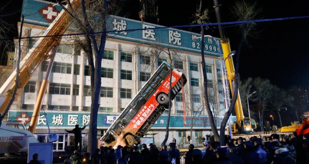 Imagens exibidas pela mídia estatal chinesa mostram o coletivo caindo na cratera, que chegou a cerca de 80 metros quadrados na cidade de Xining.