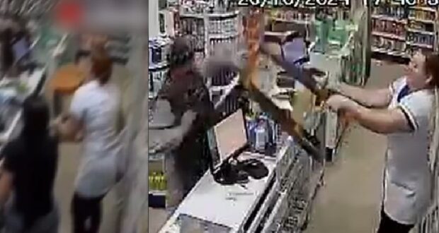 Câmeras de vigilância de uma farmácia no Distrito Federal registraram o momento em que um homem leva cadeiradas de uma funcionária ao tentar assaltar o local usando um facão. O caso ocorreu neste sábado (26), em Santa Maria.