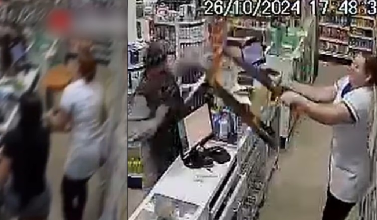 Nas imagens, o suspeito tenta se aproximar, mas uma das funcionárias levanta uma cadeira de madeira e o golpeia. O homem então foge do local, e a funcionária ainda o persegue.