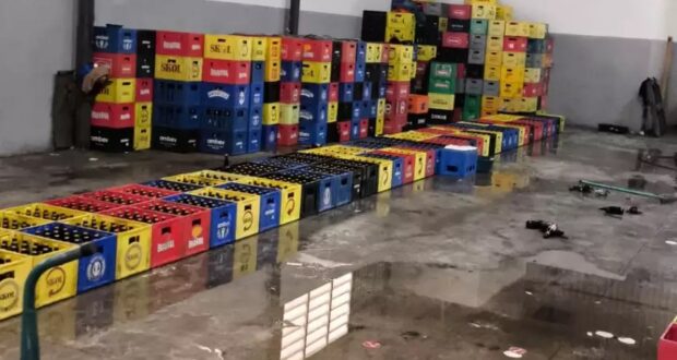 No barracão, foram apreendidos dezenas de engradados de cerveja, além de rótulos e tampas de bebidas de grande consumo no mercado.