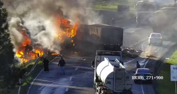 A colisão provocou um incêndio e bloqueou o trânsito no km 272 da rodovia. Conforme informações preliminares, um dos veículos carregava soja e o outro transportava frutas.