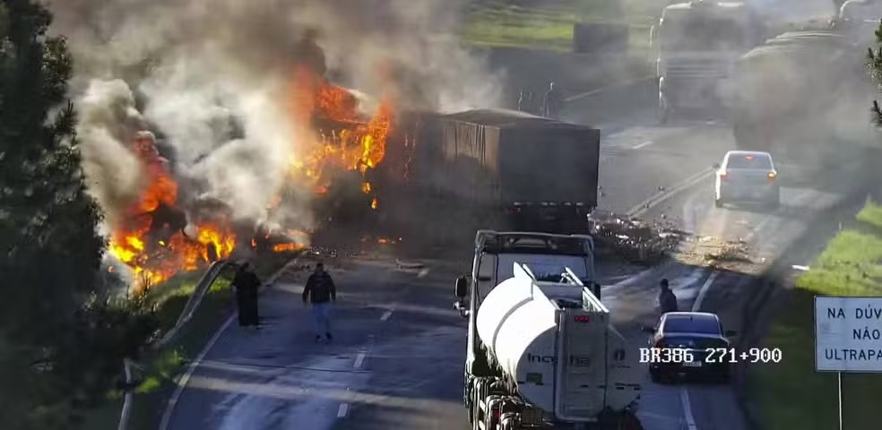 A colisão provocou um incêndio e bloqueou o trânsito no km 272 da rodovia. Conforme informações preliminares, um dos veículos carregava soja e o outro transportava frutas.