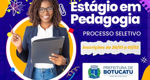 A Secretaria Municipal de Educação de Botucatu, em parceria com o CIEE, abrirá processo seletivo para estágio na área de Pedagogia com atuação na Educação Especial, nas Unidades Escolares da Rede Municipal de Ensino (Educação Infantil e Fundamental).AQUI https://www.botucatu.sp.gov.br/estagio-em-pedagogia Para se inscrever o candidato deve estar no Curso Superior em Pedagogia. A jornada de trabalho será de 30 horas semanais, com bolsa auxílio de R$ 950,00 e auxílio-transporte de R$ 50,00. O processo seletivo, através de uma prova escrita, ocorrerá no dia 02/02/2024 às 19 horas na EMEFI Dr. Cardoso de Almeida (Cardosinho), na Praça Prof. Martinho Nogueira – Centro. Serviço: Secretaria Municipal de Educação Rua Dr. José Barbosa de Barros, 120 – Vila dos Lavradores Telefone: (14) 3811-3150