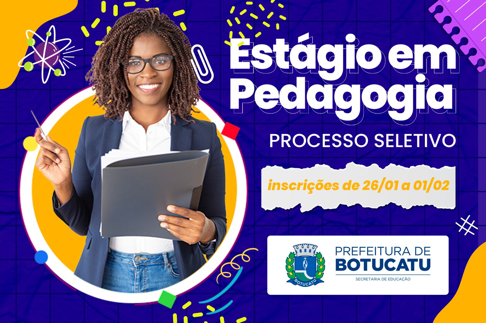 A Secretaria Municipal de Educação de Botucatu, em parceria com o CIEE, abrirá processo seletivo para estágio na área de Pedagogia com atuação na Educação Especial, nas Unidades Escolares da Rede Municipal de Ensino (Educação Infantil e Fundamental).AQUI https://www.botucatu.sp.gov.br/estagio-em-pedagogia Para se inscrever o candidato deve estar no Curso Superior em Pedagogia. A jornada de trabalho será de 30 horas semanais, com bolsa auxílio de R$ 950,00 e auxílio-transporte de R$ 50,00. O processo seletivo, através de uma prova escrita, ocorrerá no dia 02/02/2024 às 19 horas na EMEFI Dr. Cardoso de Almeida (Cardosinho), na Praça Prof. Martinho Nogueira – Centro. Serviço: Secretaria Municipal de Educação Rua Dr. José Barbosa de Barros, 120 – Vila dos Lavradores Telefone: (14) 3811-3150