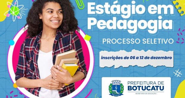 A Secretaria Municipal de Educação de Botucatu informa que a partir desta sexta-feira, 06, estará com inscrições abertas para processo seletivo de estágio na área de Pedagogia, com atuação na nas Unidades Escolares da Rede Municipal de Ensino (Educação Infantil e Fundamental), no ano letivo de 2025.