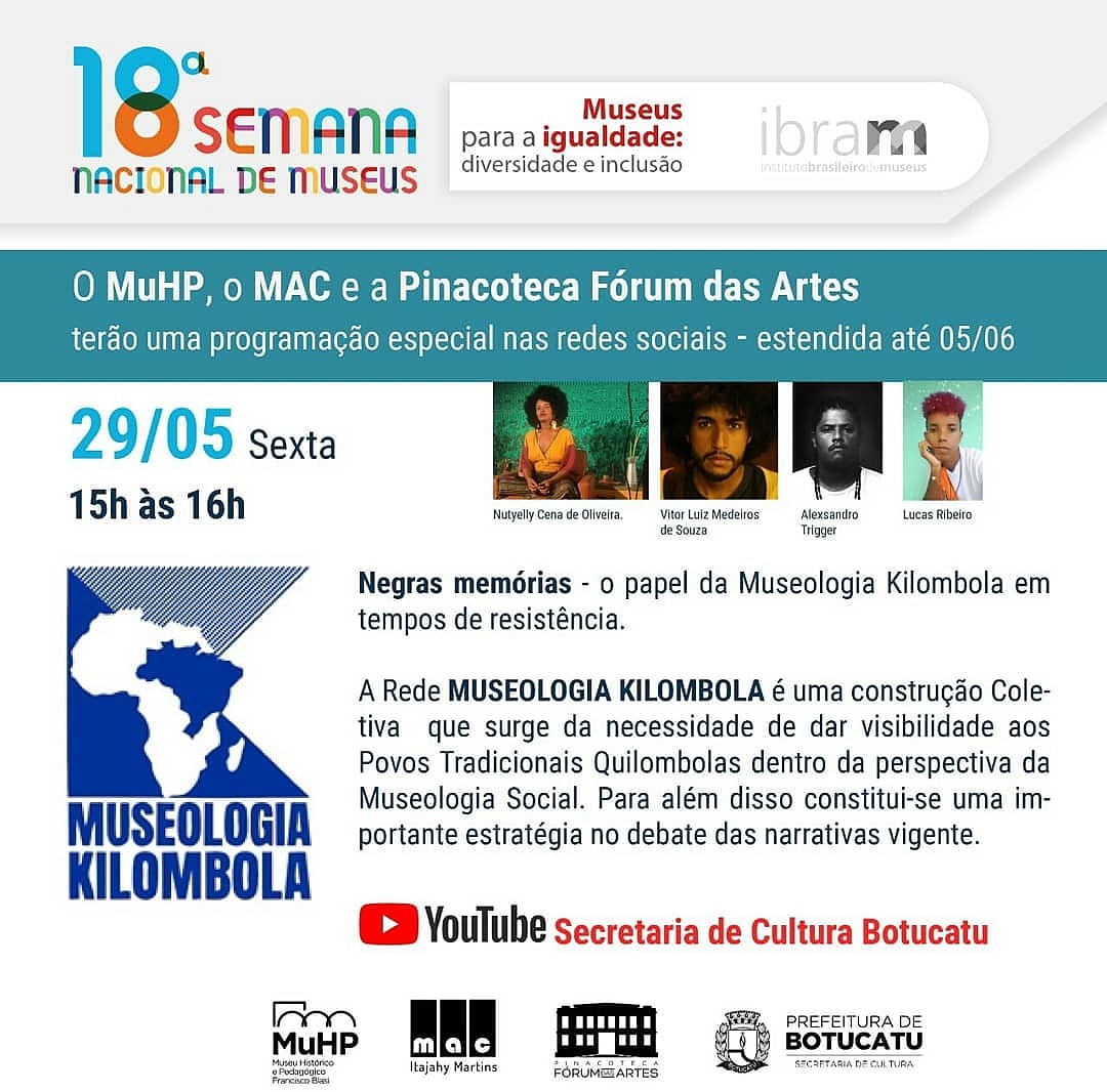 Nossos primeiros convidados são a Rede MUSEOLOGIA KILOMBOLA com a temática NEGRAS MEMÓRIAS: O Papel da Museologia Kilombola em Tempos de Resistência, conversaremos sobre as narrativas vigentes, na Cultura, na Sociedade, na Museologia, na História, nos Quilombos e Favelas.
