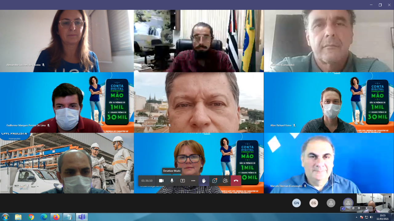 Os vereadores Abelardo (REPUBLICANOS), Alessandra Lucchesi (PSDB), Cula (PSDB), Cláudia Gabriel (DEM), Marcelo Sleiman (DEM), Lelo Pagani (PSDB) e Palhinha (DEM) participaram, na manhã desta quinta-feira (11/03), de uma reunião remota com representantes da CPFL. O objetivo principal foi entender a logística da empresa em relação à utilização dos postes por empresas concessionárias, como as de telefonia.