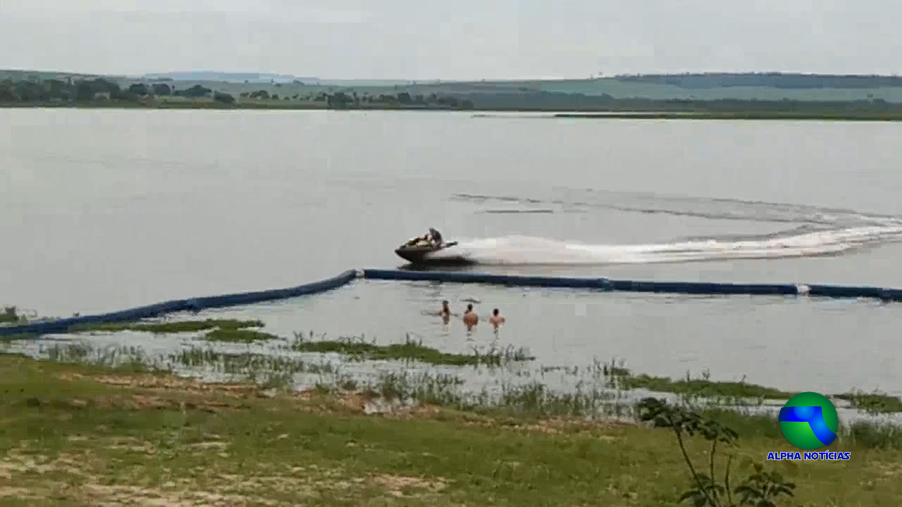 Não feliz com isso, o cidadão amarra uma “boia de piscina” ao jet ski e puxa uma criança de aproximadamente 6 anos junto com ele e outra no próprio equipamento, nestas mesmas manobras.
